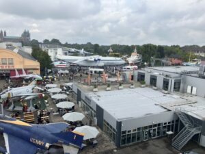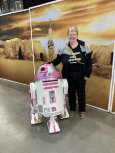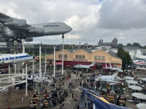 Drinnen tummelten sich bereits viele kostümierte Fans. Vorwiegend waren es Kostüme aus Star Wars und Star Trek. Auch wir trugen unsere Star Trek-Uniformen. Obwohl ich besser meine Kolinahr-Robe angezogen hätte. Denn es war doch recht frisch an dem Morgen. Vor der Raumfahrthalle wurde gerade eine Szene aus einem Star Wars-Film von Fans gespielt. Wir nutzten den Seiteneingang und gingen gleich die Perry-Fans vom Mannheimer Stammtisch besuchen. Die halten seit einigen Jahren hier die Fahne für PERRY RHODAN hoch. Beim Bummel durch die Halle trafen wir viele bekannte Gesichter aus der Fanszene, sowohl von PERRY als auch von Star Trek. Wir fuhren auch mit dem Aufzug aufs Dach und genossen den Blick auf das Getümmel. Später aßen wir eine Pizza, die überraschend lecker geschmeckt hat und schauten uns auf dem Gelände um. Schließlich gibt es hier viele Flugzeuge, Autos und Schiffe zu sehen. Mein Mann stieg sogar die Stufen zur 747 hoch. Ich blieb wegen meiner Höhenangst lieber unten. Mir war schon beim ersten Besuch vor zehn Jahren in dem Flieger schlecht geworden.