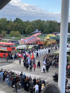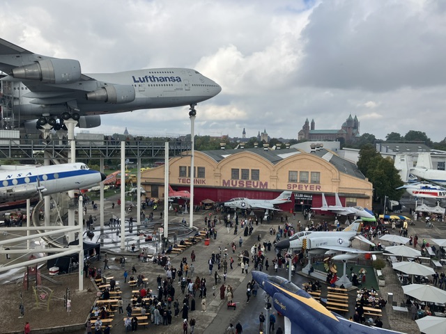 Am Samstag morgen sind wir dann nach Speyer zum Science-Fiction-Treffen ins Technik-Museum gefahren. Wir waren früh dort, aber der Ansturm auf die Parkplätze war schon groß. Auf dem großen Parkplatz am Dom parkten wir dann kostenlos, weil wir ein E-Auto haben. Vorm Museum hatten sich zwei lange Schlangen gebildet, wobei keiner wusste, welche Schlange für was war, für Leute mit Online-Ticket und für die ohne. Aber das war am Ende egal, denn man konnte auch drinnen noch Tickets kaufen. Man wurde nur vorher kontrolliert, was man so dabei hatte. Echte Waffen und Wasserflaschen aus Glas waren verboten, weshalb mein Mann wieder zurück ans Auto musste. Das hätte man vielleicht vorher mal kommunizieren müssen. Das steht nämlich nicht in der Hausordnung auf der Internetseite.