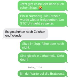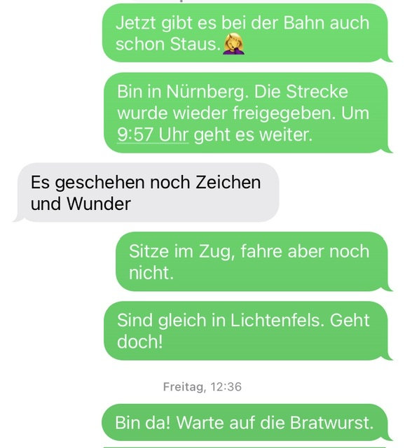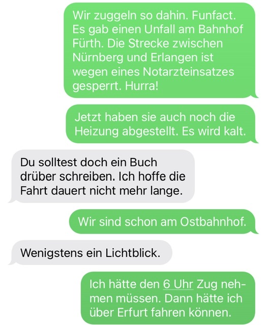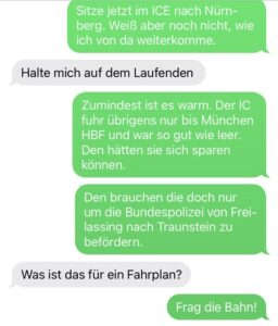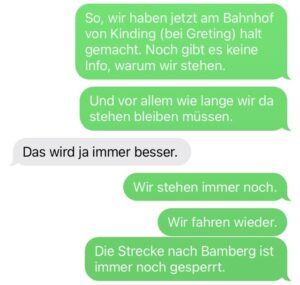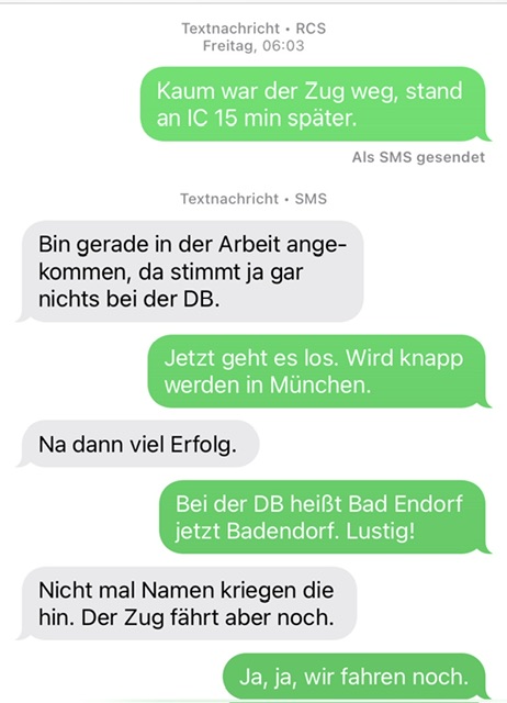 Folgender Dialog, den ich an diesem Tag mit meinem Mann per SMS geführt habe, offenbart das Drama. Ich hätte an dem Tag eigentlich mit der Regionalbahn um 5:44 Uhr fahren sollen, aber wegen Fahrplanänderungen forderte mich die DB auf, eine alternative Verbindung zu suchen. Ich hatte die Wahl mit der Regionalbahn um 6:00 Uhr oder dem IC um 6.09 Uhr. Ich entschied mich für den IC, weil ich dann in München nicht so weit laufen muss. Laut App und laut Anzeige war der IC auch pünktlich bis … Die Regionalbahn war gerade abgefahren, schaltete die Anzeige um und der IC hatte plötzlich 25 Minuten Verspätung. Was für ein fieser Trick! Das haben die doch schon zwei Minuten früher gewusst.