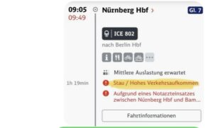 Eigentlich hätte ich in Bamberg in den ICE nach München umsteigen müssen. Der wurde mir aber als völlig überbucht angezeigt (zumindest bis Nürnberg). Also blieb ich im IC bis nach Nürnberg sitzen, weil ich Angst hatte, dass man mich in Bamberg nicht würde einsteigen lassen. Ist mir schon passiert. Warum mir die App den Umstieg nicht grundsätzlich in Nürnberg anbietet, verstehe ich nicht, aber das muss ich wahrscheinlich auch nicht.