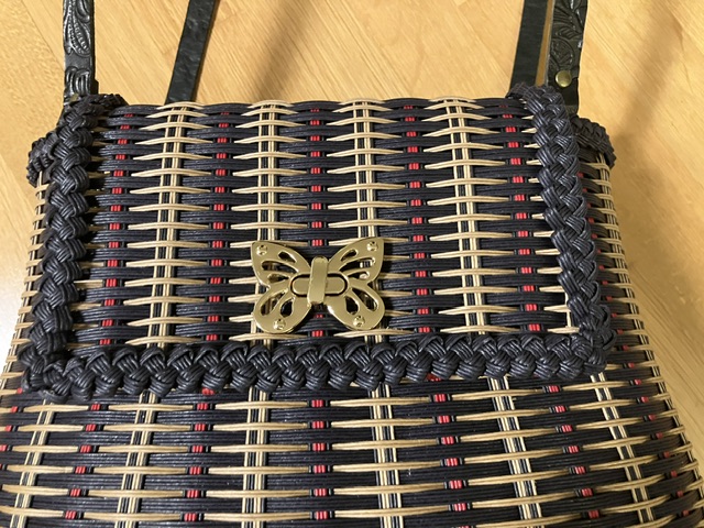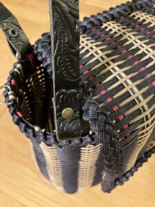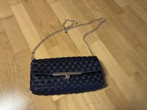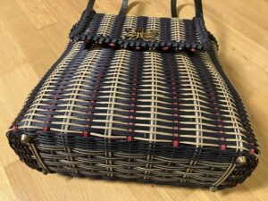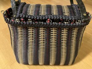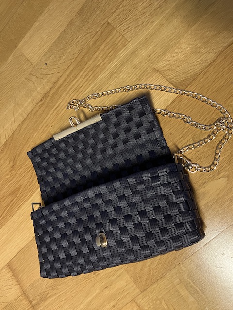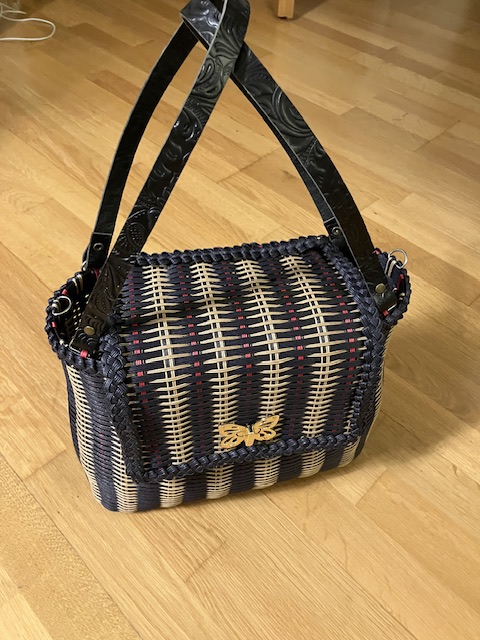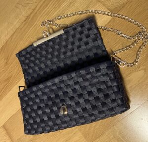 Bei der Tasche war es ähnlich. Hier habe ich die Form etwas angepasst und die Tasche höher gemacht, als beim Originalmuster. Außerdem hat meine diese kurvige Form, die ein bisschen an eine Taille erinnert. Das kniffligste war der Deckel. Da mussten die Stränge genau aneinander passen, so dass er sich dann problemlos hochklappen lässt. Als Henkel habe ich gemustertes Leder genommen, das passte am besten dazu. Und weil ich mir für die Clutch diverse Verschlüsse bestellt habe, konnte ich einen davon gleich verwenden.