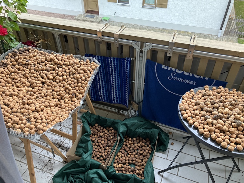 Das Foto beweist, die Nussernte 2025 war sehr üppig. (Eine Kiste war schon voll, die ist hier nicht mit drauf.) Wir hatten ein paar Platzprobleme beim Trocknen. Dabei waren wir gerade in der heißen Phase eine Woche im Urlaub und habe nicht so viel sammeln können. Das muss ich beim nächsten Mal besser planen.