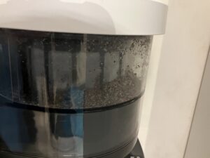 Nach dem Anschalten und wenn die Waschmaschine startet, klingt es erstmal komisch. Es läuft aber tatsächlich nur, wenn die Maschine abpumpt. Dann sorgt ein Motor dafür, dass das Abwasser wie ein Strudel durch den Filter gepresst wird. Am Ende, wenn das Wasser komplett abgeflossen ist, bleiben die trockenen Reste übrig. Wenn der Filter voll ist, kann man den Inhalt herausschaben und im Hausmüll entsorgen und den Filter anschließend wieder einsetzen. Bitte nicht mit Wasser auswaschen, weil das kontraproduktiv wäre.