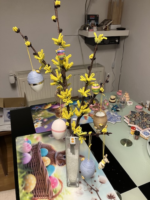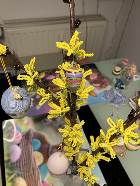 In diesem Jahr habe ich die Zweige für unseren Osterstrauch selbst gemacht. Aus vielen kleinen Perlen. Seht selbst: