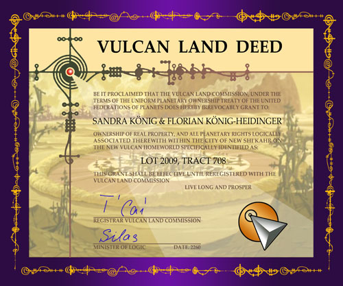 Diese Akademie-Urkunden gehören meinem Mann und mir. Das "Vulcan Land Deed" war ein Hochzeitsgeschenk für Freunde. Quelle: Star Trek Properties.com Die passenden Unterschriften werden wir wohl auf einer der nächsten FedCons einholen.